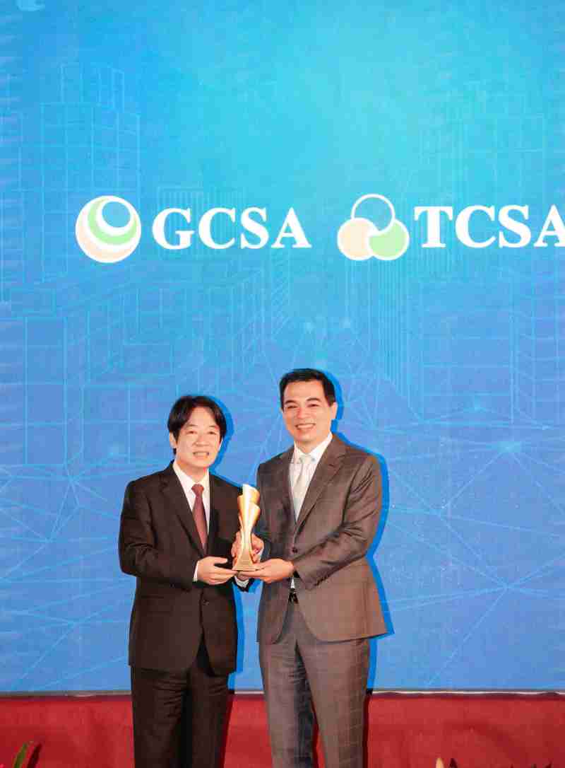 达全方位永续表现获全球永续奖及台湾永续奖肯定,,,由副总统赖清德颁奖 (左),,,,冰球突破总经理柯富仁 (右) 代表领奖