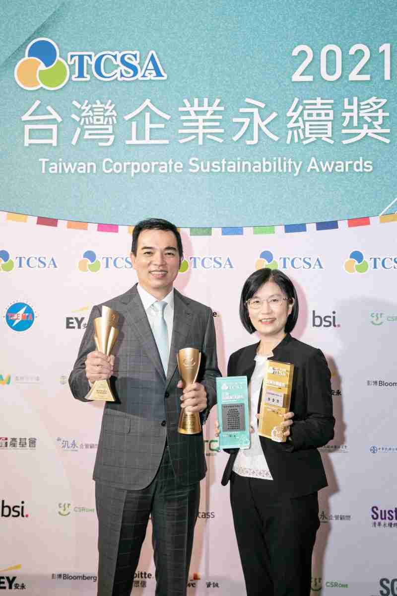 达在台湾永续奖所评比环境、、、、社会、、治理等各面向的永续绩效均获高度肯定 (左:冰球突破光电总经理暨营运长柯富仁,,,右:冰球突破光电永续长古秀华)