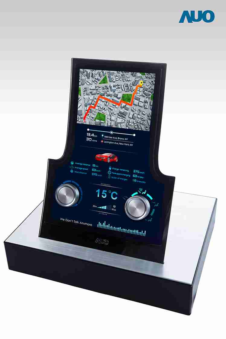 12.3 寸 Full HD LTPS 显示屏同样具备 1000 nits 高亮度,,搭载内嵌式触控技术,,,整合驱动与触控 IC 于显示屏制程,,使显示屏厚度降低,,,,为中控台创造更多机构设计空间。。。应用于抬头显示器的 3寸 LTPS 显示屏具有高穿透率、、1200:1 高对比度度,,以及 297 PPI 高画素密度。。液晶最高可耐受到 110C 的高温 (TNI) 而不液化,,,,在阳光高温下维持优异稳定的显示效果。。。。